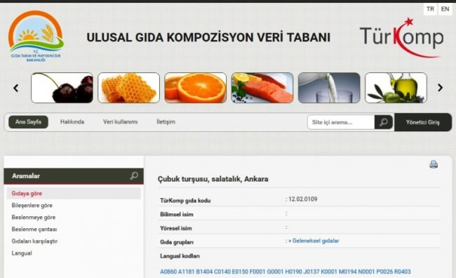 ULUSAL GIDA KOMPOZİSYON VERİ TABANI Türkomp geleneksel gıdalar arasında olan Ankara Çubuk Salatalık Turşusu değerleri belirlendi.