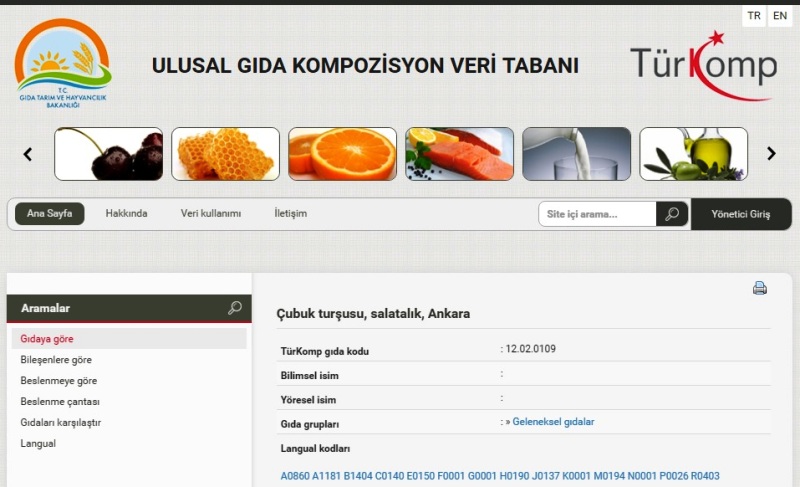 DetailsULUSAL GIDA KOMPOZİSYON VERİ TABANI Türkomp geleneksel gıdalar arasında olan Ankara Çubuk Salatalık Turşusu değerleri belirlendi.